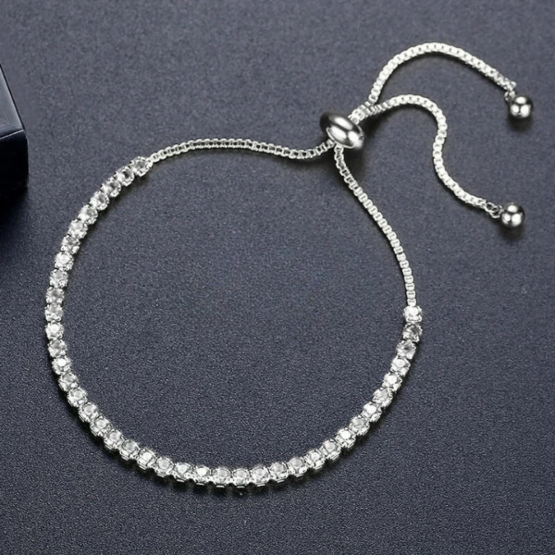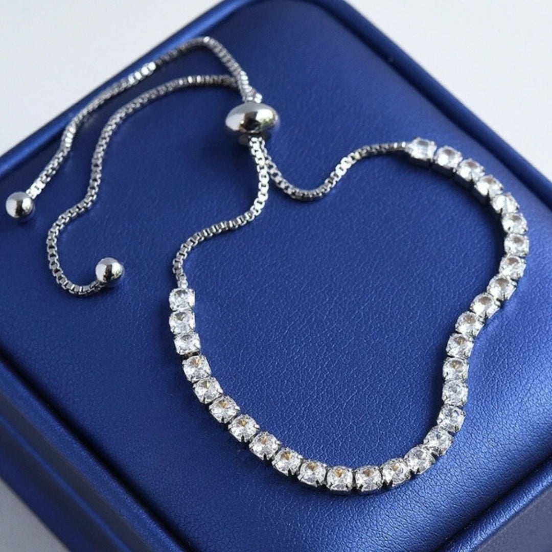 L'Étoile Polaire incarne la sophistication. Orné de zircons brillants taillés avec précision, ce bracelet capture la lumière avec l'éclat du diamant. Sa monture rhodiée assure une brillance durable, tandis que son fermoir bolo offre un ajustement sur mesure. Un accessoire de luxe minimaliste.