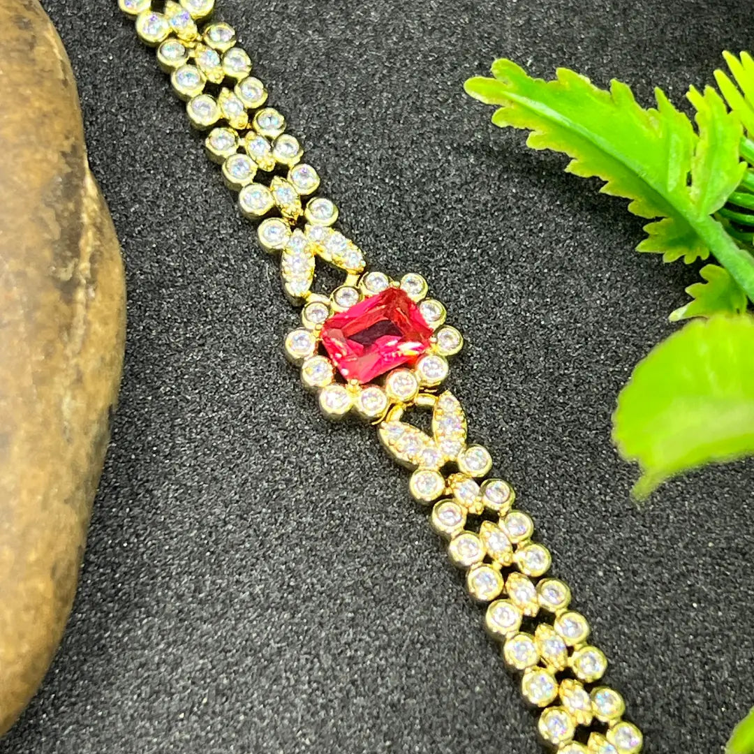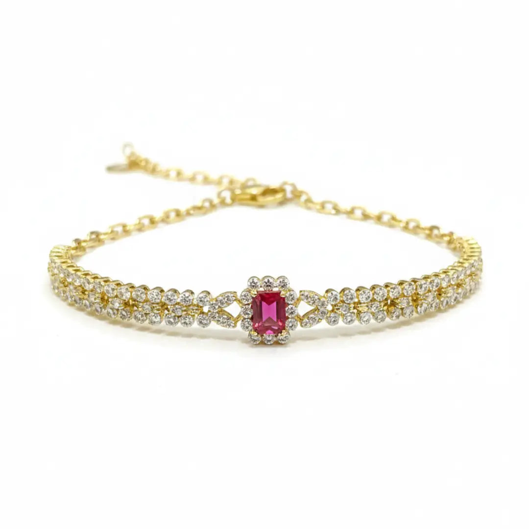 Sublimez votre poignet avec ce bracelet raffiné en finition or jaune, une pièce maîtresse alliant luxe et délicatesse. Ce bijou se distingue par sa double rangée de cristaux scintillants et son rubis central taille émeraude, offrant un contraste éclatant et intemporel.